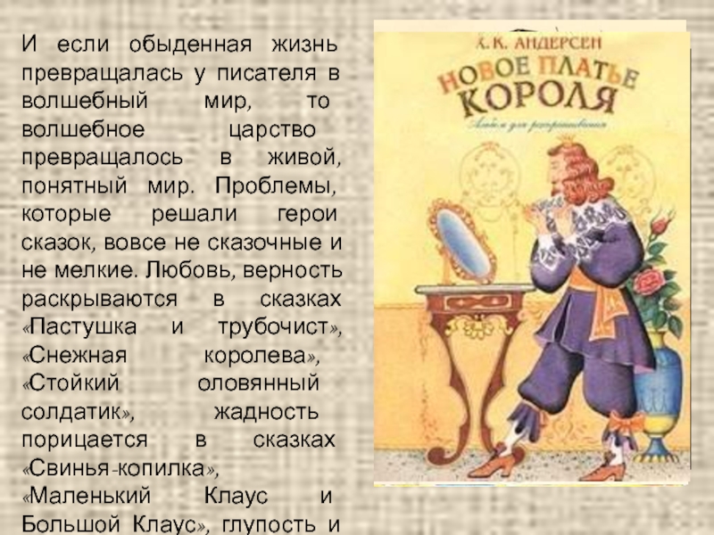 волшебное царство превращалось в живой, понятный мир. Проблемы, которые решали герои сказок, вовсе не сказочные и не мелкие. Любовь, верность раскрываются в сказках «Пастушка и трубочист», «Снежная королева», «Стойкий оловянный солдатик», жадность порицается в сказках «Свинья-копилка», «Маленький Клаус и Большой Клаус», глупость и чванство — в сказках «Гадкий утенок», «Принцесса на горошине», «Новое платье короля»
