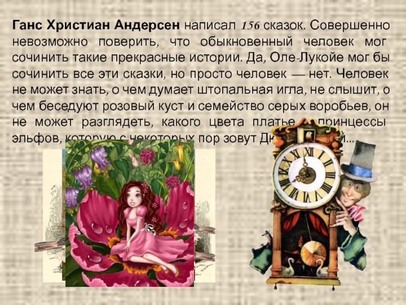 Слайд 2Ганс Христиан Андерсен написал 156 сказок. Совершенно невозможно поверить, что обыкновенный