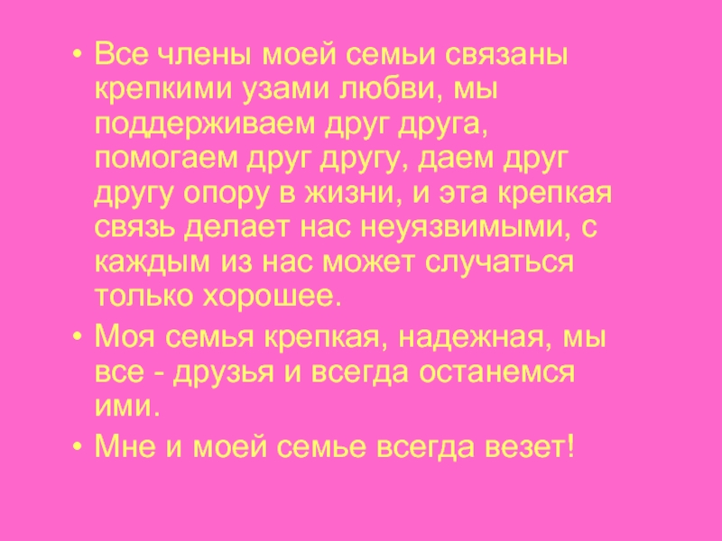 Слайд 7Все члены моей семьи связаны крепкими узами любви, мы поддерживаем друг
