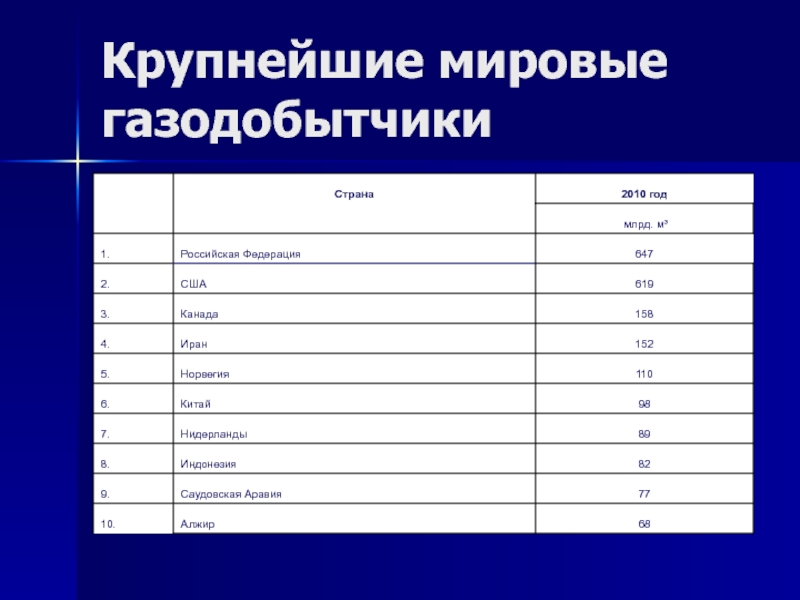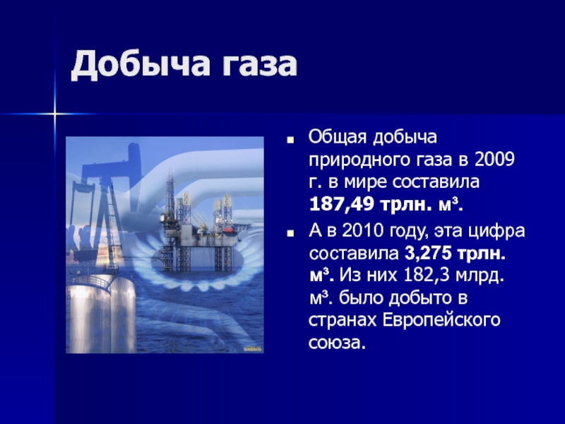А в 2010 году, эта цифра составила 3,275 трлн. м³. Из них 182,3 млрд. м³. было добыто в странах Европейского союза.