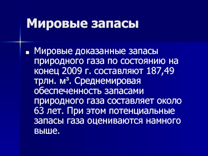 г. составляют 187,49 трлн. м³. Среднемировая обеспеченность запасами природного газа составляет около 63 лет. При этом потенциальные запасы газа оцениваются намного выше.