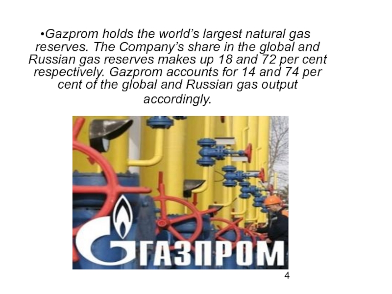 Слайд 4Gazprom holds the world’s largest natural gas reserves. The Company’s share