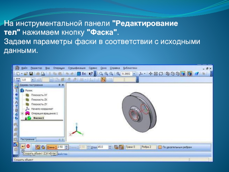 Слайд 13На инструментальной панели "Редактирование тел" нажимаем кнопку "Фаска".