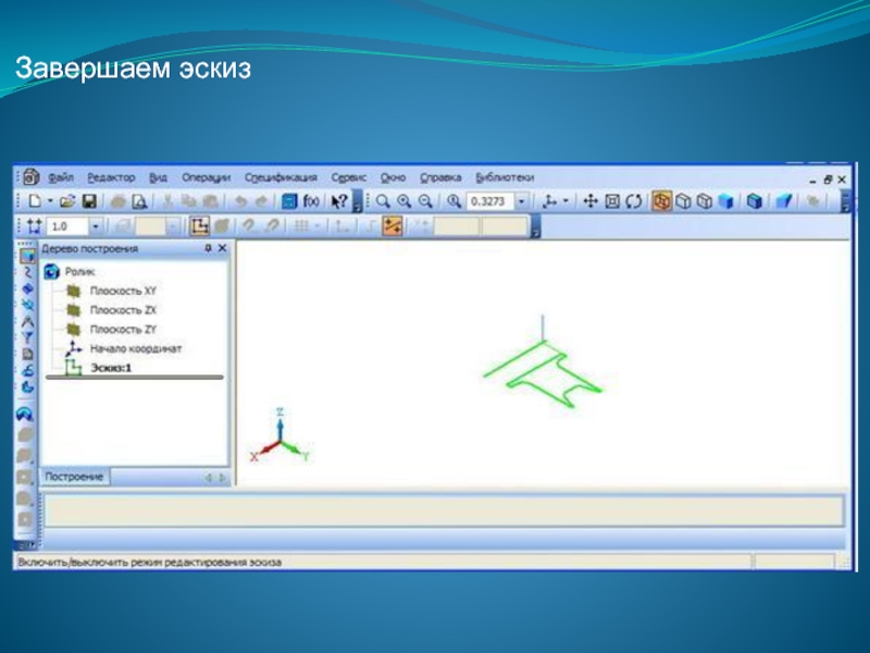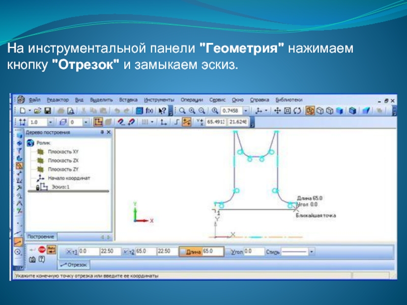 Слайд 10На инструментальной панели "Геометрия" нажимаем кнопку "Отрезок" и замыкаем эскиз.