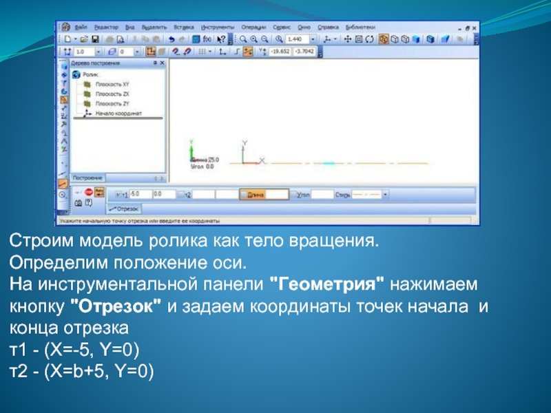 На инструментальной панели "Геометрия" нажимаем кнопку "Отрезок" и задаем