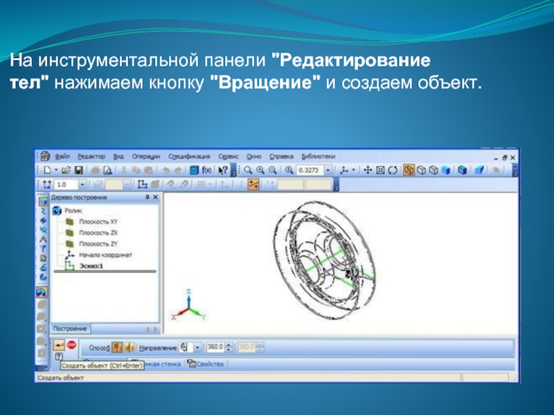 Слайд 12На инструментальной панели "Редактирование тел" нажимаем кнопку "Вращение" и создаем объект.
