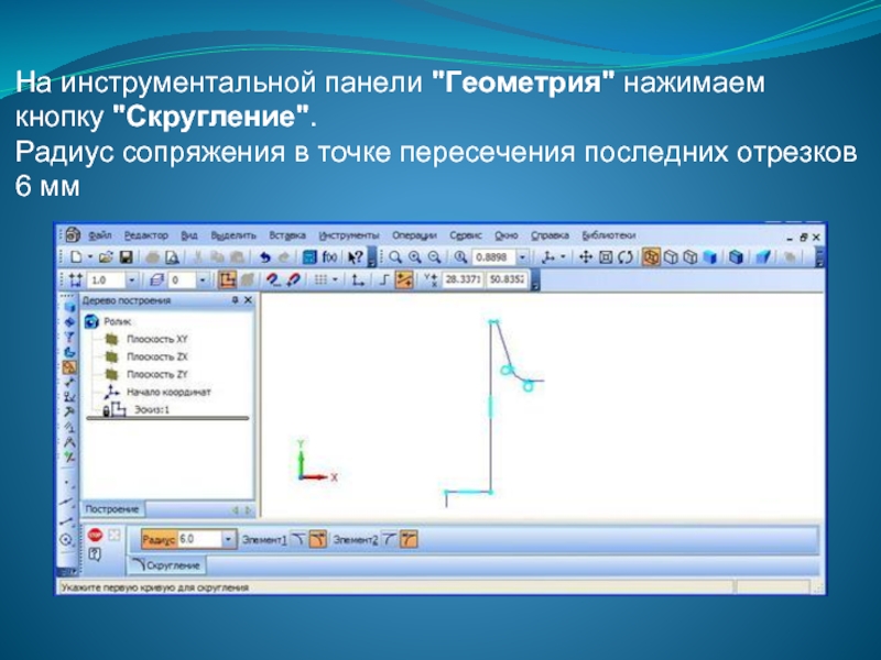Слайд 8На инструментальной панели "Геометрия" нажимаем кнопку "Скругление".