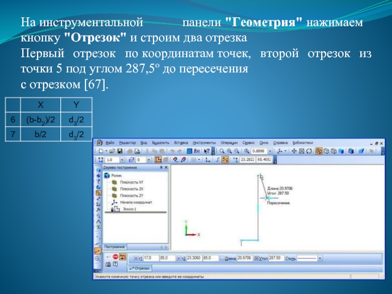 Слайд 7На инструментальной панели "Геометрия" нажимаем кнопку "Отрезок" и строим два отрезка