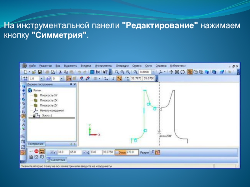 Слайд 9На инструментальной панели "Редактирование" нажимаем кнопку "Симметрия".