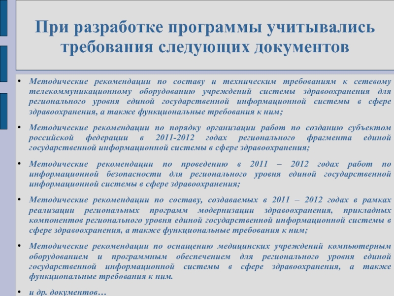 Слайд 12МЕТОДИЧЕСКИЕ РЕКОМЕНДАЦИИ ПО ОСНАЩЕНИЮ МЕДИЦИНСКИХ УЧРЕЖДЕНИЙ КОМПЬТЕРНЫМ ОБОРУДОВАНИЕМ И ПРОГРАММНЫМ ОБЕСПЕЧЕНИЕМ