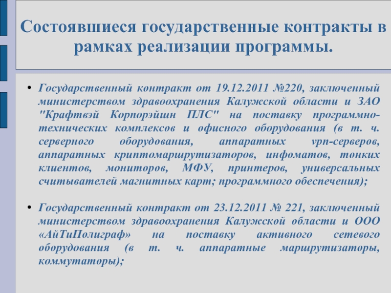 Государственный контракт от 23.12.2011 № 221, заключенный министерством здравоохранения Калужской области и ООО «АйТиПолиграф» на поставку активного сетевого оборудования (в т. ч. аппаратные маршрутизаторы, коммутаторы);