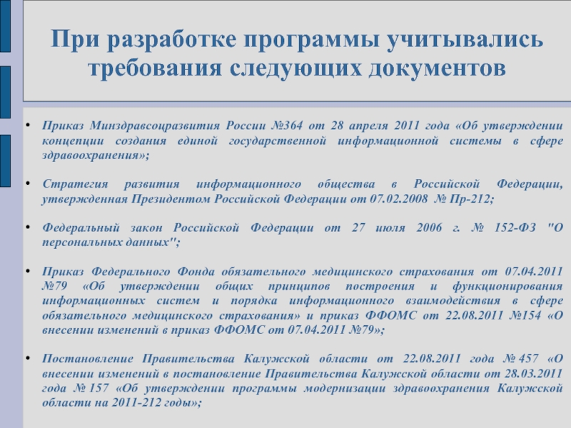 Приказ Федерального Фонда обязательного медицинского страхования от 07.04.2011 №79 «Об утверждении общих принципов построения и функционирования информационных систем и порядка информационного взаимодействия в сфере обязательного медицинского страхования» и приказ ФФОМС от 22.08.2011 №154 «О внесении изменений в приказ ФФОМС от 07.04.2011 №79»;