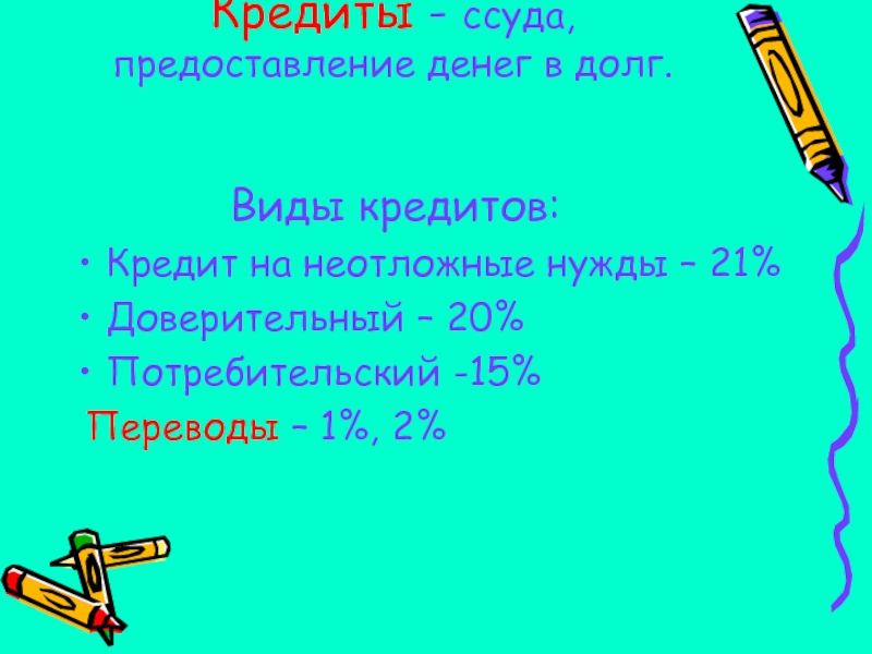 Слайд 3Кредиты - ссуда, предоставление денег в долг.