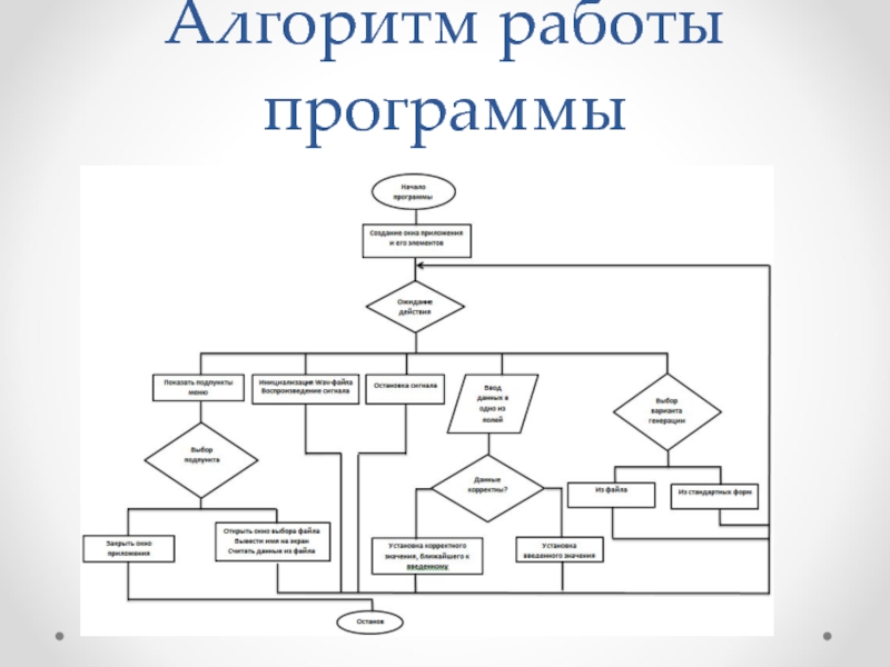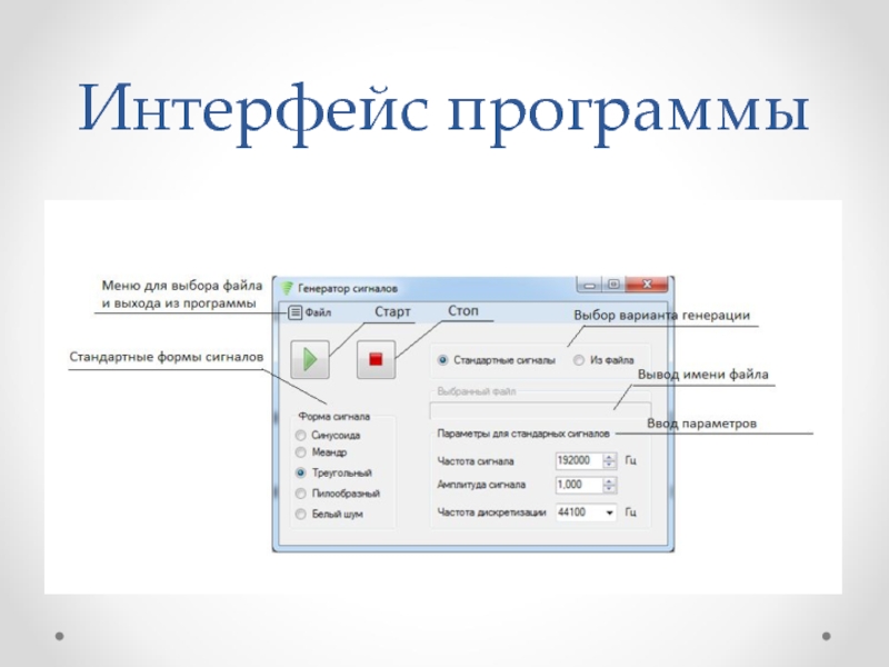 программа генерирует сигнал необходимой формы с заданными параметрами;