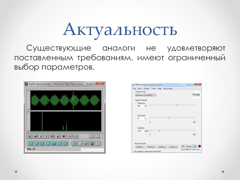Существующие аналоги не удовлетворяют поставленным требованиям, имеют ограниченный выбор параметров.