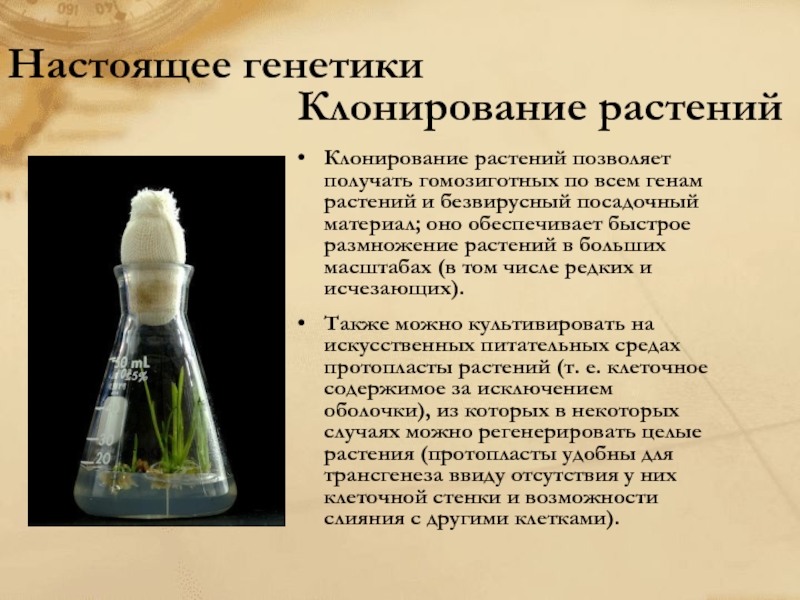 Клонирование растений позволяет получать гомозиготных по всем генам растений и безвирусный посадочный материал; оно обеспечивает быстрое размножение растений в больших масштабах (в том числе редких и исчезающих).