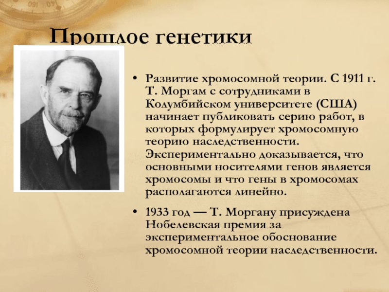 1933 год — Т. Моргану присуждена Нобелевская премия за экспериментальное обоснование хромосомной теории наследственности.