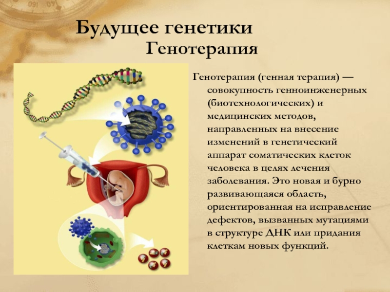 терапия) — совокупность генноинженерных (биотехнологических) и медицинских методов, направленных на внесение изменений в генетический аппарат соматических клеток человека в целях лечения заболевания. Это новая и бурно развивающаяся область, ориентированная на исправление дефектов, вызванных мутациями в структуре ДНК или придания клеткам новых функций.