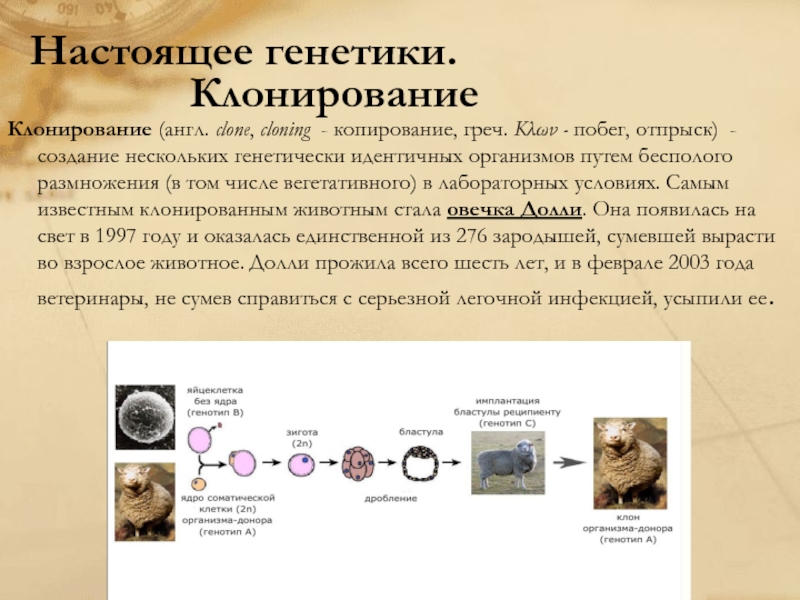 Клонирование (англ. clone, cloning - копирование, греч. Κλων - побег, отпрыск) -создание нескольких генетически идентичных организмов путем бесполого размножения (в том числе вегетативного) в лабораторных условиях. Самым известным клонированным животным стала овечка Долли. Она появилась на свет в 1997 году и оказалась единственной из 276 зародышей, сумевшей вырасти во взрослое животное. Долли прожила всего шесть лет, и в феврале 2003 года ветеринары, не сумев справиться с серьезной легочной инфекцией, усыпили ее.