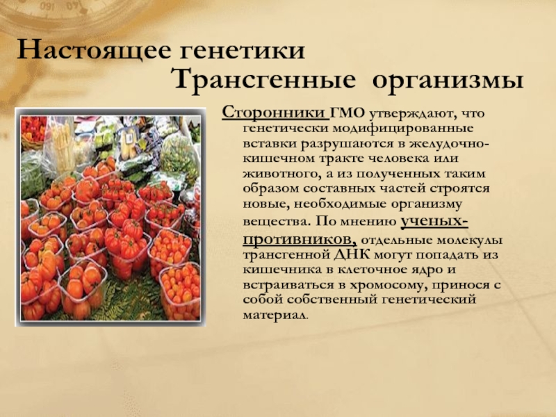 Сторонники ГМО утверждают, что генетически модифицированные вставки разрушаются в желудочно-кишечном тракте человека или животного, а из полученных таким образом составных частей строятся новые, необходимые организму вещества. По мнению ученых-противников, отдельные молекулы трансгенной ДНК могут попадать из кишечника в клеточное ядро и встраиваться в хромосому, принося с собой собственный генетический материал.