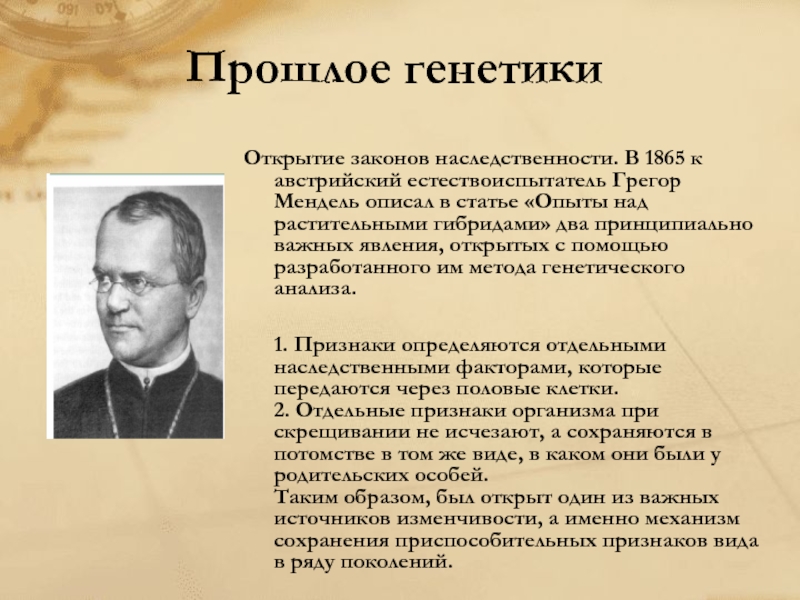 наследственности. В 1865 к австрийский естествоиспытатель Грегор Мендель описал в статье «Опыты над растительными гибридами» два принципиально важных явления, открытых с помощью разработанного им метода генетического анализа.