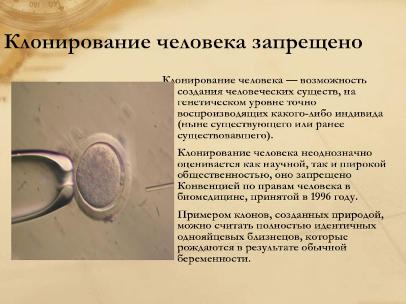 Клонирование человека неоднозначно оценивается как научной, так и широкой общественностью, оно запрещено Конвенцией по правам человека в биомедицине, принятой в 1996 году.