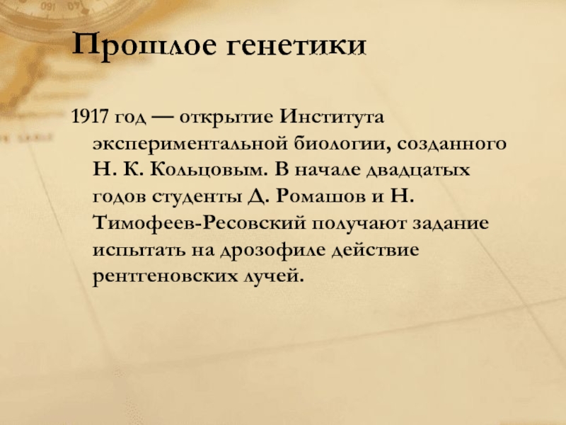 Кольцовым. В начале двадцатых годов студенты Д. Ромашов и Н. Тимофеев-Ресовский получают задание испытать на дрозофиле действие рентгеновских лучей.