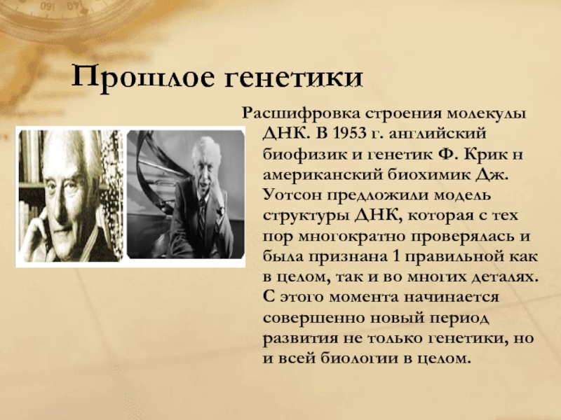генетик Ф. Крик н американский биохимик Дж. Уотсон предложили модель структуры ДНК, которая с тех пор многократно проверялась и была признана 1 правильной как в целом, так и во многих деталях. С этого момента начинается совершенно новый период развития не только генетики, но и всей биологии в целом.