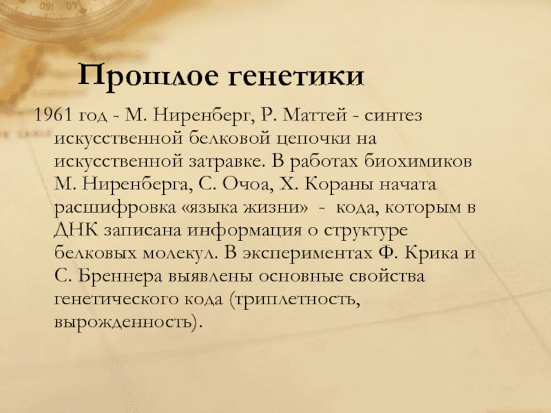 искусственной белковой цепочки на искусственной затравке. В работах биохимиков М. Ниренберга, С. Очоа, X. Кораны начата расшифровка «языка жизни» - кода, которым в ДНК записана информация о структуре белковых молекул. В экспериментах Ф. Крика и С. Бреннера выявлены основные свойства генетического кода (триплетность, вырожденность).