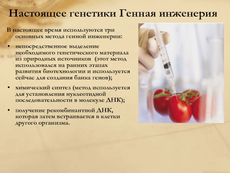 непосредственное выделение необходимого генетического материала из природных источников (этот метод использовался на ранних этапах развития биотехнологии и используется сейчас для создания банка генов);