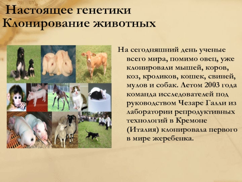 сегодняшний день ученые всего мира, помимо овец, уже клонировали мышей, коров, коз, кроликов, кошек, свиней, мулов и собак. Летом 2003 года команда исследователей под руководством Чезаре Галли из лаборатории репродуктивных технологий в Кремоне (Италия) клонировала первого в мире жеребенка.
