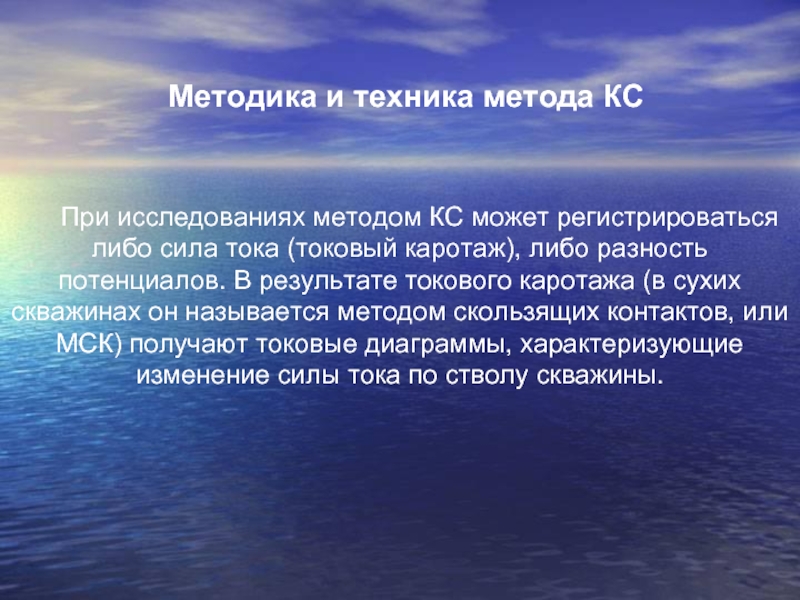 Слайд 33При исследованиях методом КС может регистрироваться либо сила тока (токовый каротаж),