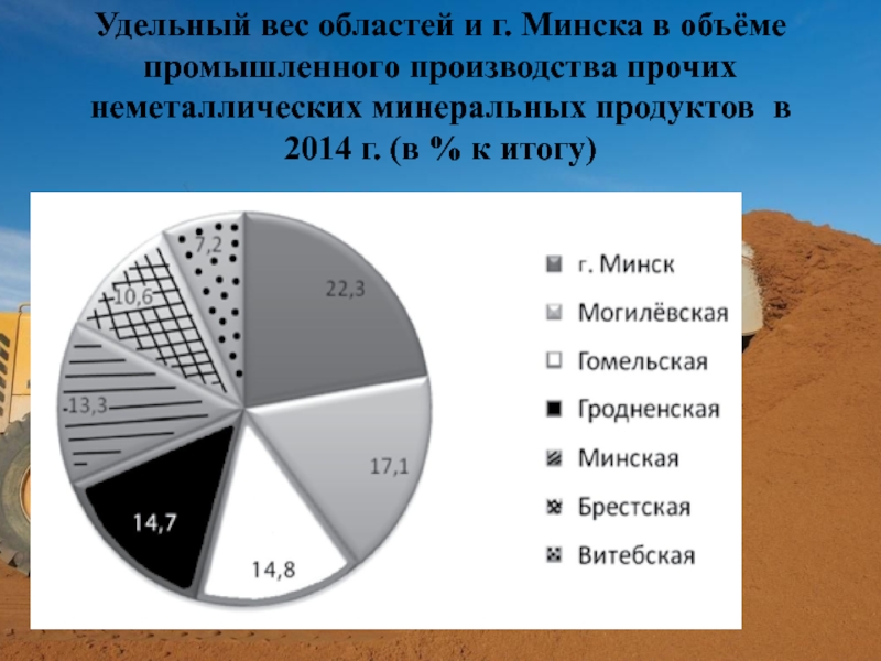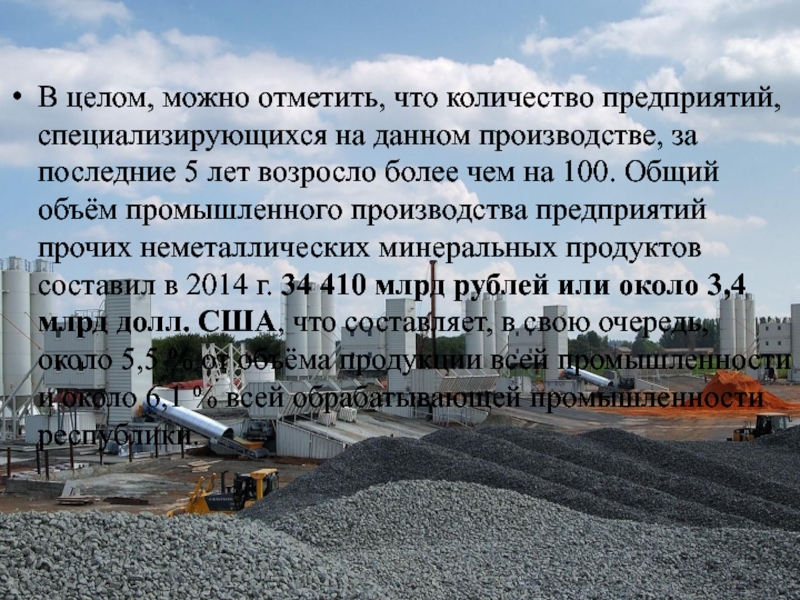производстве, за последние 5 лет возросло более чем на 100. Общий объём промышленного производства предприятий прочих неметаллических минеральных продуктов составил в 2014 г. 34 410 млрд рублей или около 3,4 млрд долл. США, что составляет, в свою очередь, около 5,5 % от объёма продукции всей промышленности и около 6,1 % всей обрабатывающей промышленности республики.