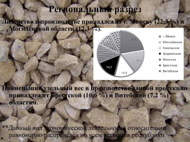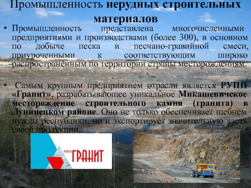 Самым крупным предприятием отрасли является РУПП «Гранит», разрабатывающее уникальное Микашевичское месторождение строительного камня (гранита) в Лунинецком районе. Оно не только обеспечивает щебнем нужды республики, но и экспортирует значительную часть своей продукции.