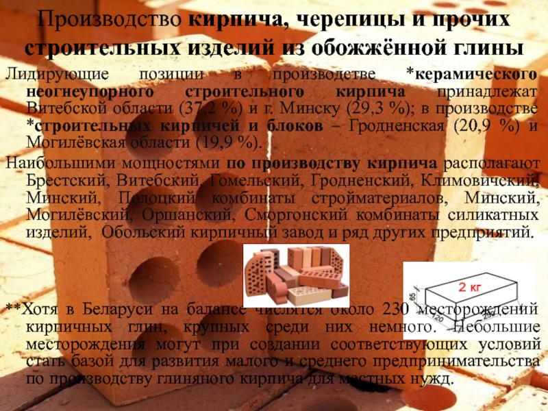 в производстве *керамического неогнеупорного строительного кирпича принадлежат Витебской области (37,2 %) и г. Минску (29,3 %); в производстве *строительных кирпичей и блоков – Гродненская (20,9 %) и Могилёвская области (19,9 %).