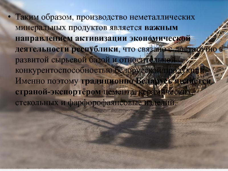 экономической деятельности республики, что связано с достаточно развитой сырьевой базой и относительной конкурентоспособностью белорусской продукции. Именно поэтому традиционно Беларусь является страной-экспортёром цемента, керамических, стекольных и фарфорофаянсовые изделий.