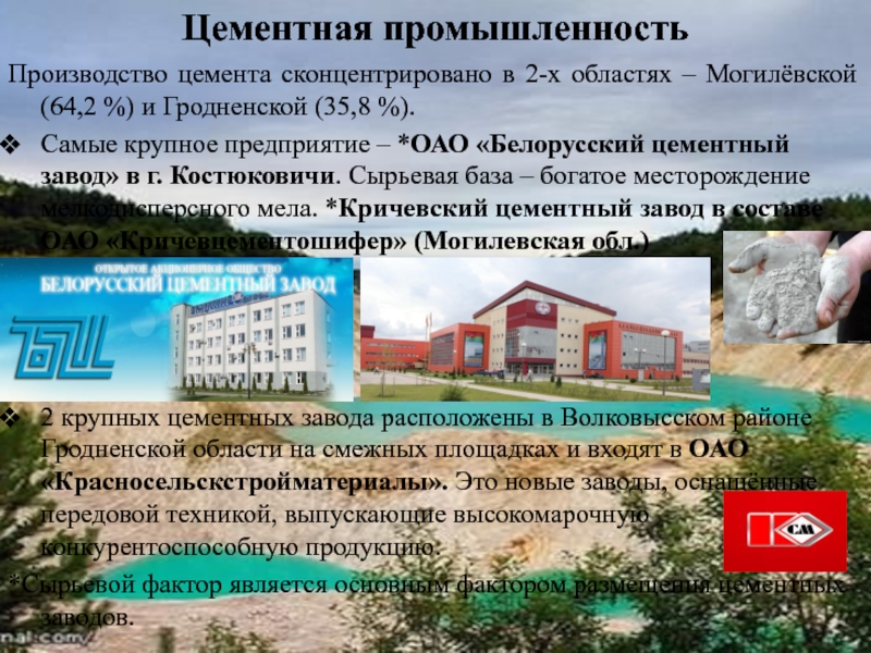 Самые крупное предприятие – *ОАО «Белорусский цементный завод» в г. Костюковичи. Сырьевая база – богатое месторождение мелкодисперсного мела. *Кричевский цементный завод в составе ОАО «Кричевцементошифер» (Могилевская обл.)