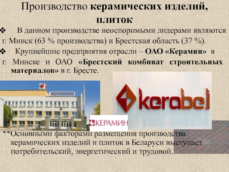 **Основными факторами размещения производства керамических изделий и плиток в Беларуси выступает потребительский, энергетический и трудовой.