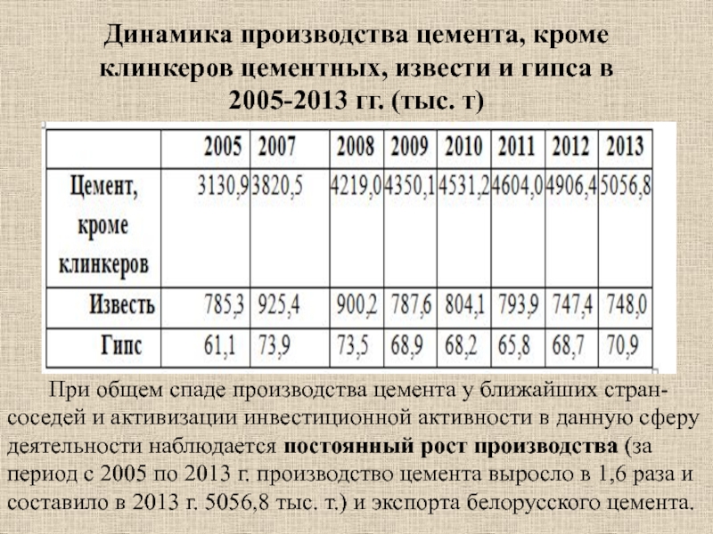 При общем спаде производства цемента у ближайших стран-соседей и активизации инвестиционной активности в данную сферу деятельности наблюдается постоянный рост производства (за период с 2005 по 2013 г. производство цемента выросло в 1,6 раза и составило в 2013 г. 5056,8 тыс. т.) и экспорта белорусского цемента.