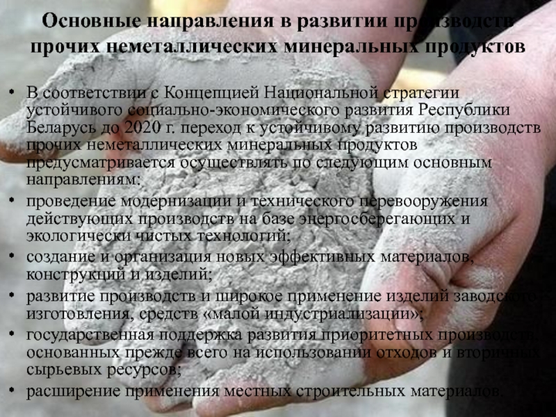 Концепцией Национальной стратегии устойчивого социально-экономического развития Республики Беларусь до 2020 г. переход к устойчивому развитию производств прочих неметаллических минеральных продуктов предусматривается осуществлять по следующим основным направлениям: