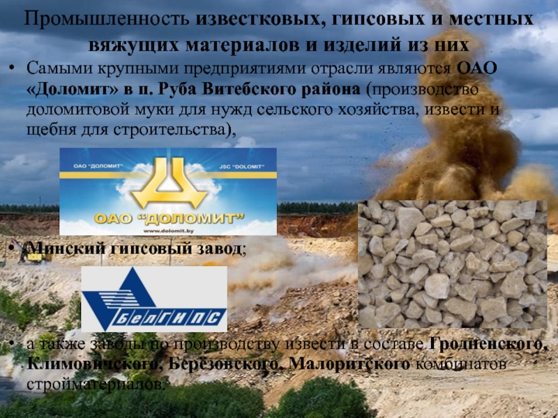 крупными предприятиями отрасли являются ОАО «Доломит» в п. Руба Витебского района (производство доломитовой муки для нужд сельского хозяйства, извести и щебня для строительства),