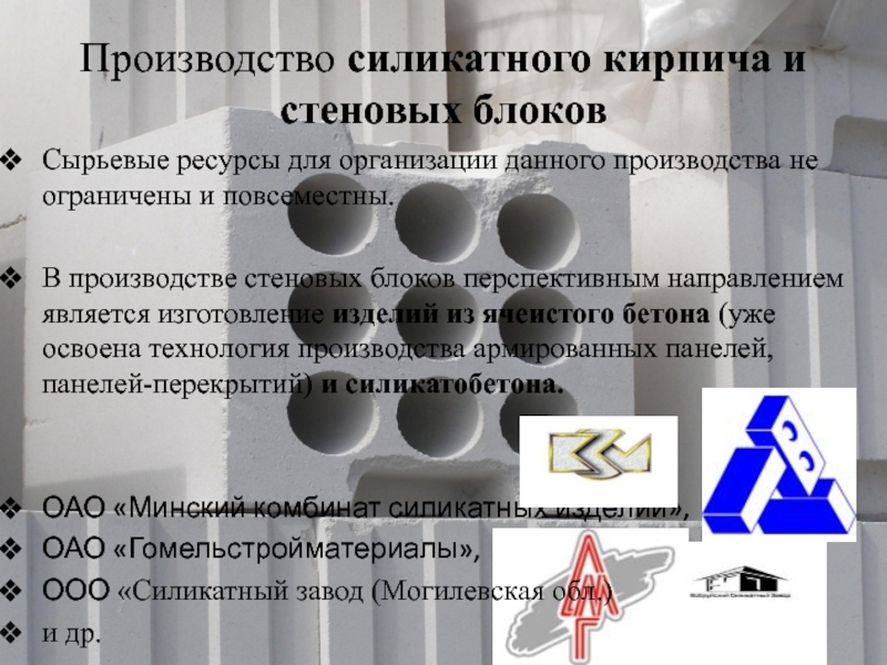 В производстве стеновых блоков перспективным направлением является изготовление изделий из ячеистого бетона (уже освоена технология производства армированных панелей, панелей-перекрытий) и силикатобетона.