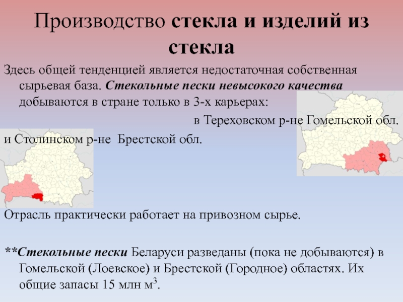 **Стекольные пески Беларуси разведаны (пока не добываются) в Гомельской (Лоевское) и Брестской (Городное) областях. Их общие запасы 15 млн м3.