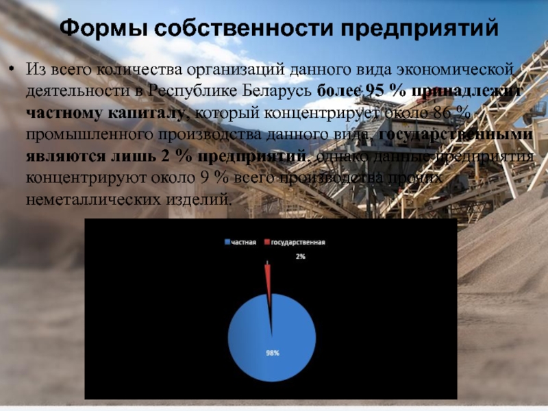 Республике Беларусь более 95 % принадлежит частному капиталу, который концентрирует около 86 % промышленного производства данного вида, государственными являются лишь 2 % предприятий, однако данные предприятия концентрируют около 9 % всего производства прочих неметаллических изделий.