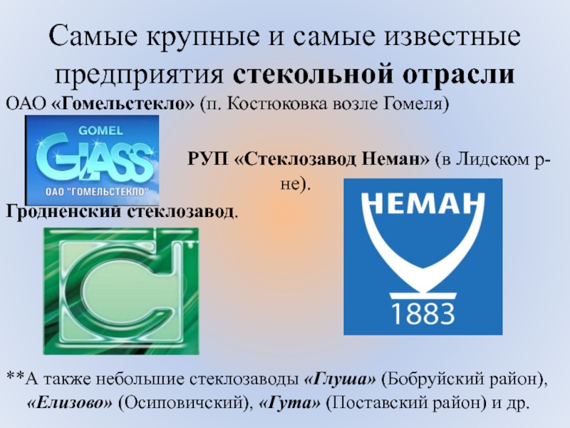 **А также небольшие стеклозаводы «Глуша» (Бобруйский район), «Елизово» (Осиповичский), «Гута» (Поставский район) и др.