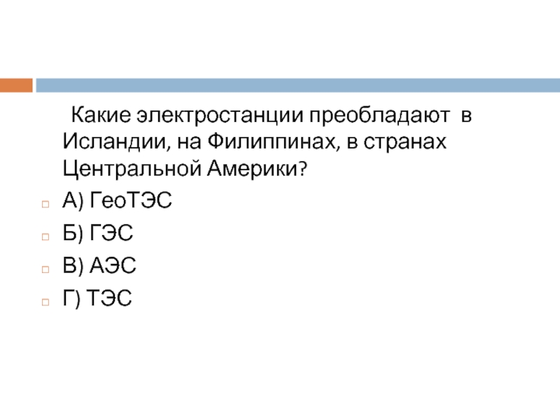 Слайд 8 Какие электростанции преобладают в Исландии, на Филиппинах, в странах Центральной Америки?