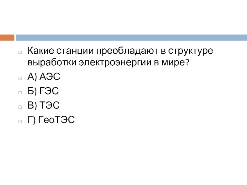 Слайд 7Какие станции преобладают в структуре выработки электроэнергии в мире?