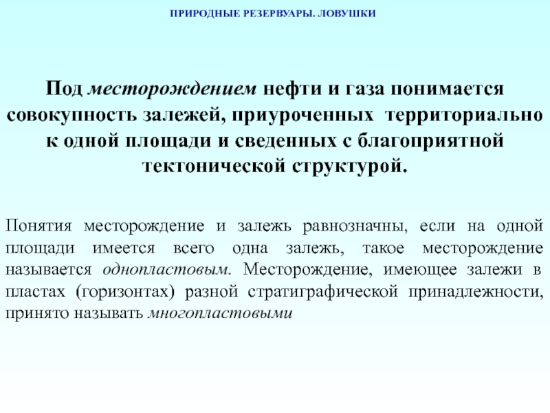 Понятия месторождение и залежь равнозначны, если на одной площади имеется всего одна залежь, такое месторождение называется однопластовым. Месторождение, имеющее залежи в пластах (горизонтах) разной стратиграфической принадлежности, принято называть многопластовыми