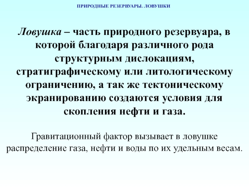 Гравитационный фактор вызывает в ловушке распределение газа, нефти и воды по их удельным весам.