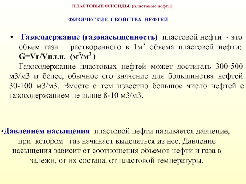 Давлением насыщения пластовой нефти называется давление, при котором газ начинает выделяться из нее. Давление насыщения зависит от соотношения объемов нефти и газа в залежи, от их состава, от пластовой температуры.